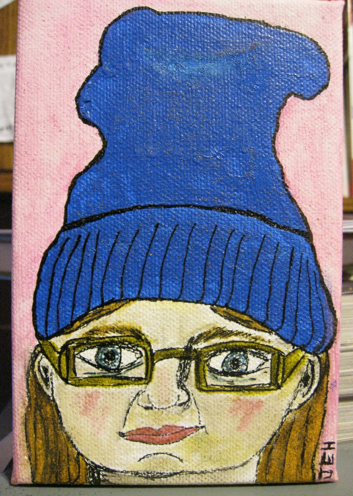 La, la, la. So, I had a completely different painting in mind for today as I walked into the house, but this one usurped it. Kept my cap on the entire time I painted and wrote--have to feel the passion on my head. I love the watery pink background on this one. It reminds me of when you are coloring Easter eggs with those little tablets and vinegar, and you're so excited to see the color changing that you take the egg out with your hexagon-shaped copper wire lifter before the color fully adheres to the white shell. Watery pink. Dreamy background for stocking hat loving baby powder.
